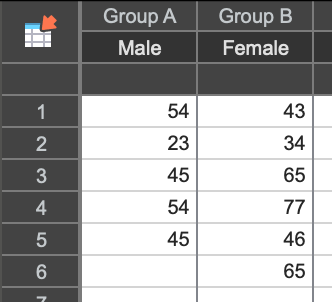 Enter the data for each group into a separate column. The two groups do not have to have the same number of values, and it's OK to leave some cells empty.
