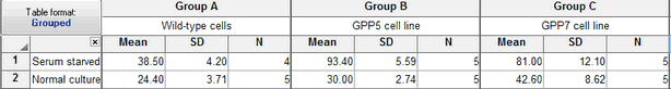 In the example above, the two rows encode the two levels of one factor (serum starved vs. normal culture) and the three data set columns encode the three levels of the other factor (cell line).