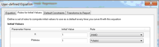 Prism can store rules (algorithms) to calculate initial values from the range of your data. If you choose a built-in equation, the rules are taken care of. If you enter your own (user-defined) equation, you can also enter rules to define the initial values of each parameter. If you enter a good set of rules, then your equation will work in the future with no need to think about initial values.