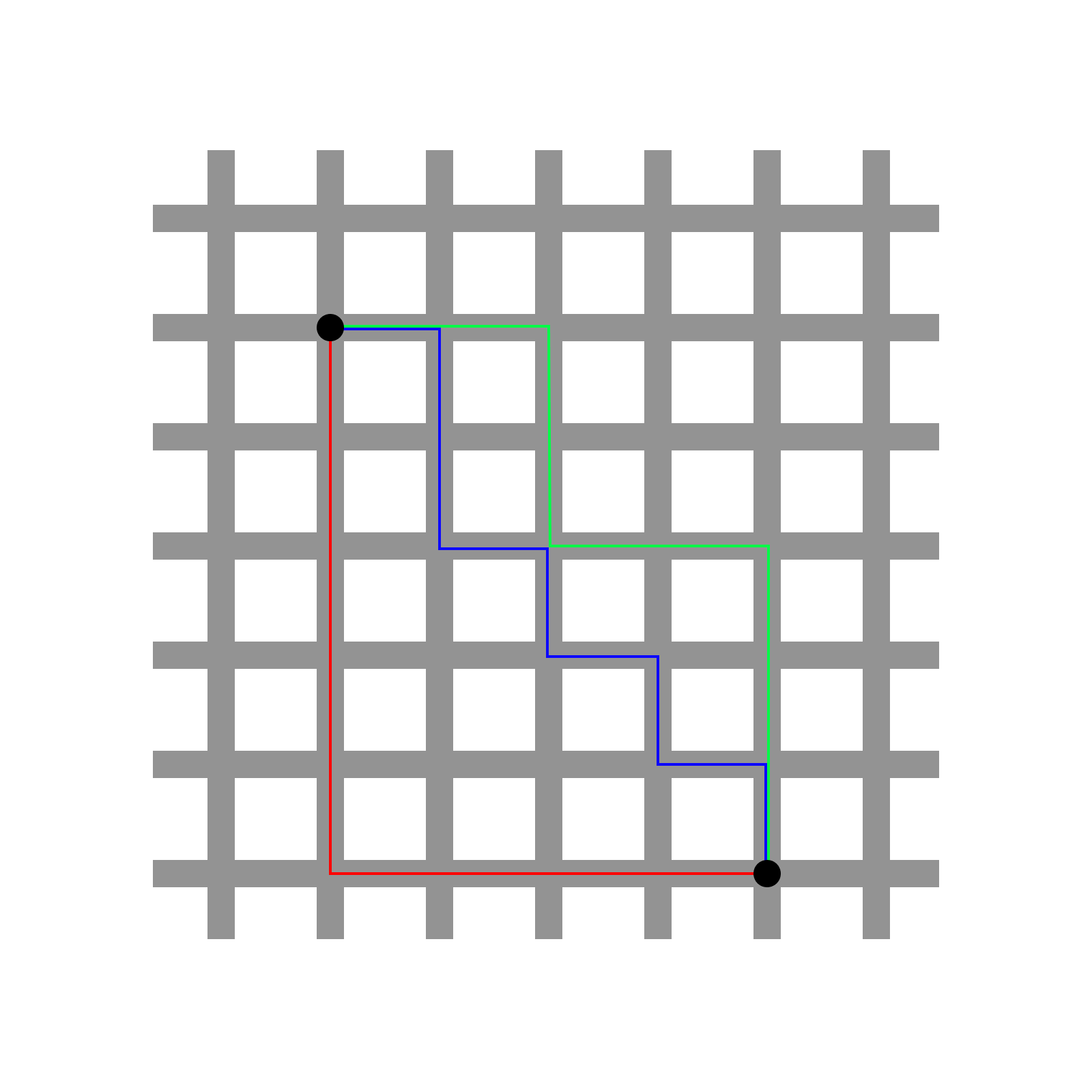 The Manhattan distance is sometimes referred to as the “taxicab” distance due to the manner that it’s most easily understood. Consider a grid pattern of roads that all intersect at 90 degree angles. If you wanted to take a taxi to get from one intersection to another, you could not travel diagonally “through” the city blocks, but rather travel in straight lines along the roads. The smallest number of blocks that you would have to travel to get from one intersection to another is the Manhattan (or taxicab) distance between these two points. In the image below, there are three possible paths (and many others) to get from one black point to another on the grid. However, the number of blocks traveled along each of these paths is the same (they all require traveling nine blocks). This value is the Manhattan distance between these points.