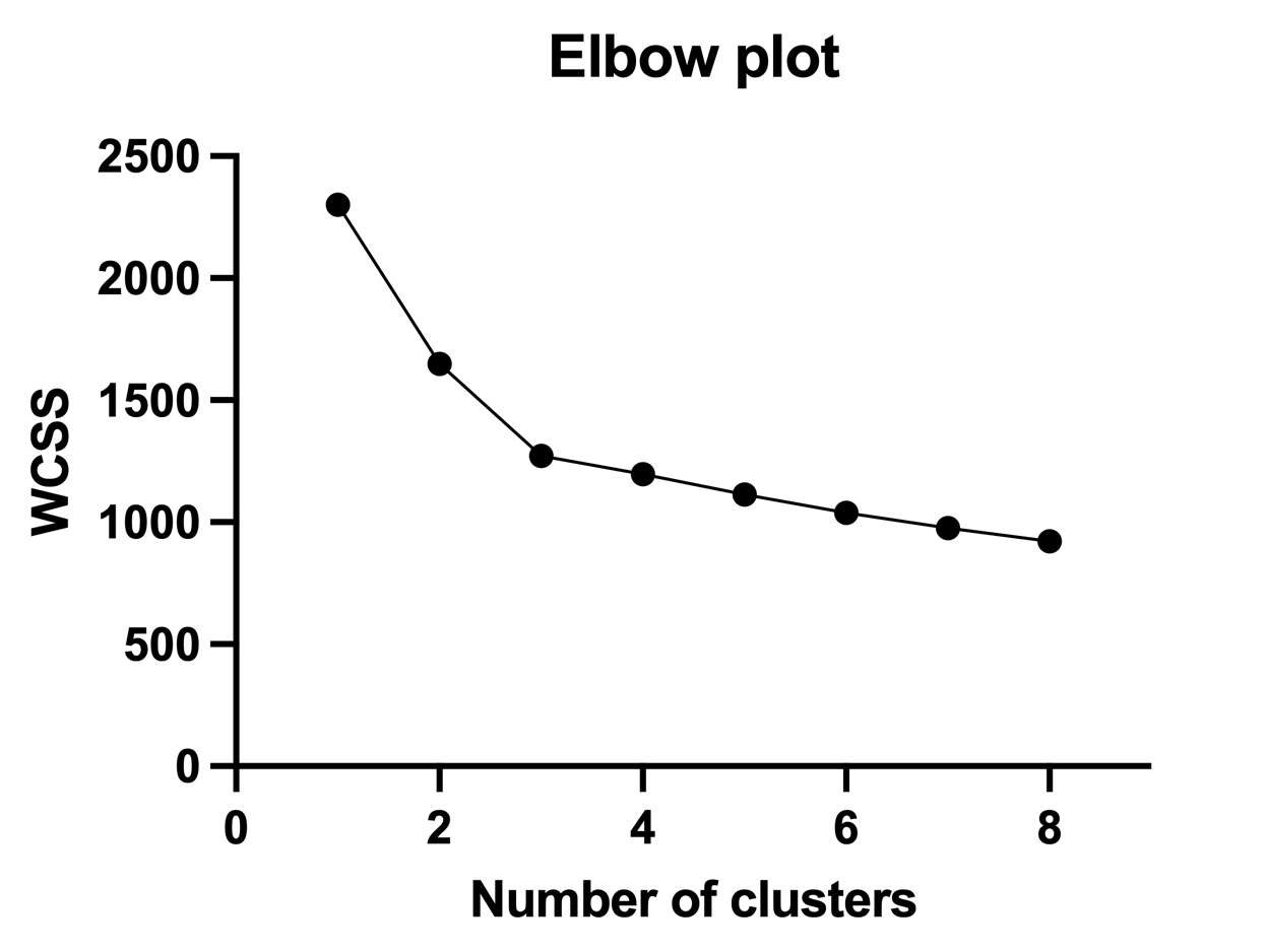 The reasoning behind this approach is that any number of clusters after the elbow result in diminished effects of reducing the WCSS (a smaller amount of overall reduction in the amount of dispersion of the data within the clusters). However, being able to select the correct elbow is extremely subjective: there’s no guarantee that two observers would choose the same elbow on the same graph! This happens because elbow plots don’t always exhibit a sharp change in the direction of the line. Because of this, other visual methods such as the silhouette method and the gap method have been developed to try and make the decision a bit more objective. However, in the example graph above, there’s a fairly clear elbow point that occurs when the number of clusters is equal to three. Therefore, using this method would suggest that the optimal number of clusters for this data is three.