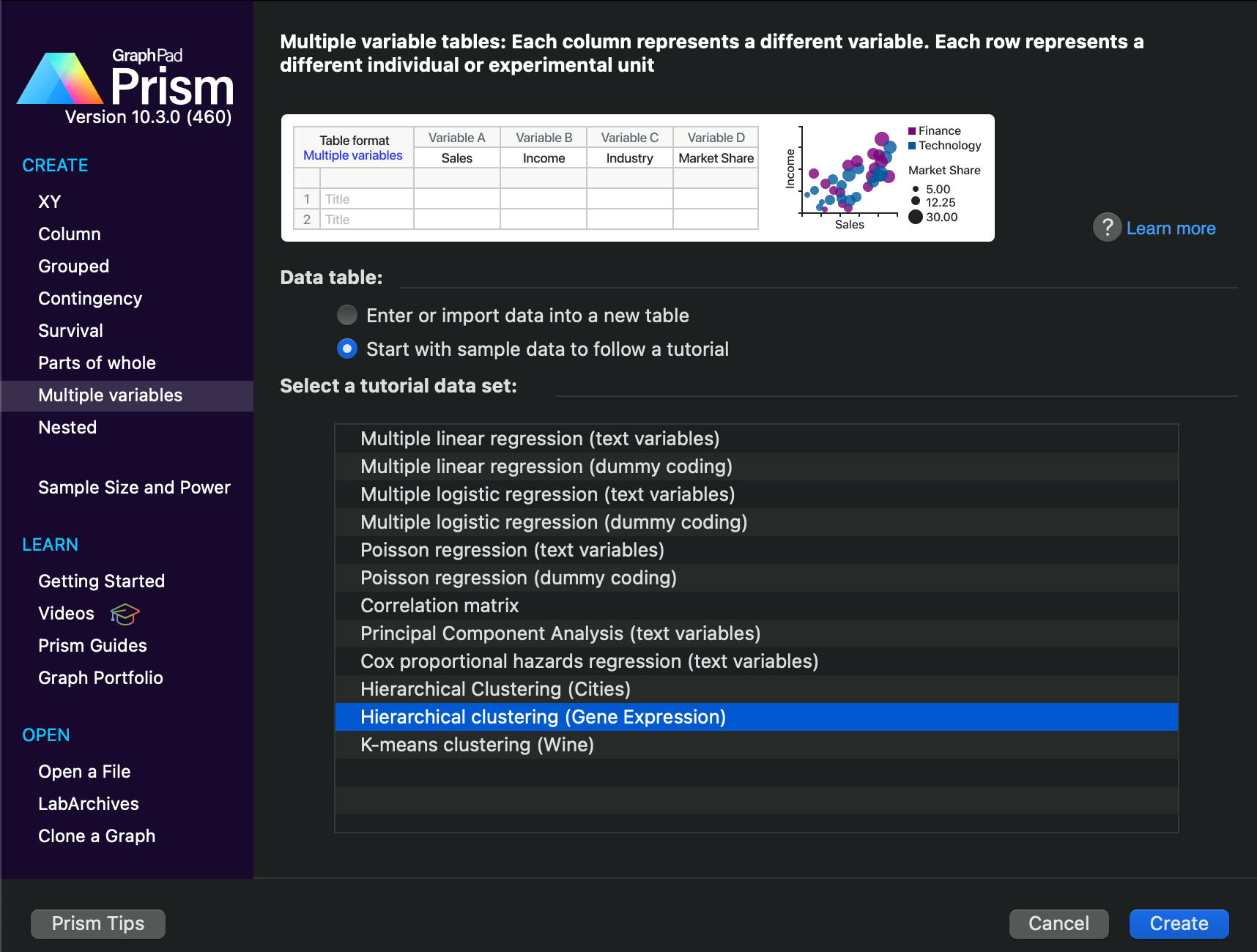 The multiple variables data table is the only type of table that can be used to perform hierarchical clustering. You may either choose to enter your own data into a new table or to start with one of the hierarchical clustering sample data sets.