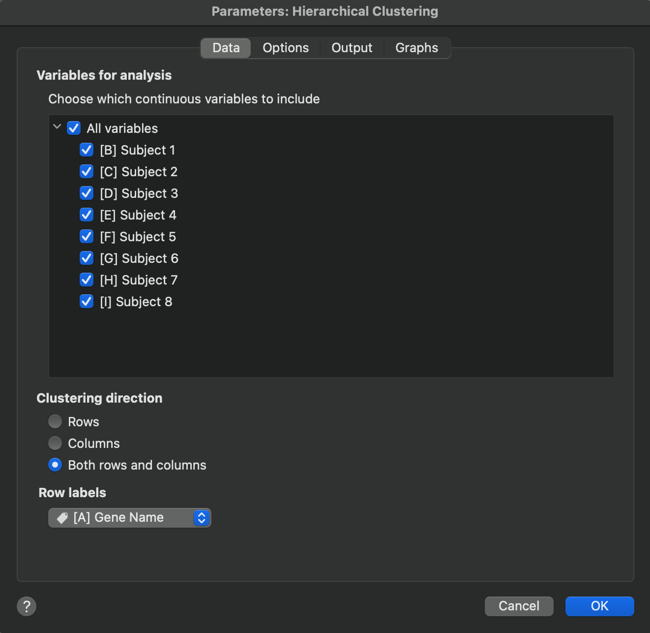 Generally, each column of a multiple variables data table represents a different variable, while each row represents a different observation or experimental replicate (subject, object, individual, etc.). The default in Prism is to perform clustering on the rows of your data. However, it’s important to note that the hierarchical clustering algorithm can be applied to rows, columns, or both within the same analysis depending on the objectives of the analytical design. When clustering rows, the values within each row (and across all relevant columns) are used to define the “location” of that row which is then used to calculate distances. When clustering columns, the values within each column (and across all relevant rows) are used to define the “location” of that column which is then used to calculate distances. Because this analysis can be performed in either “direction”, you should be careful about how you enter your data and which direction of clustering you choose.