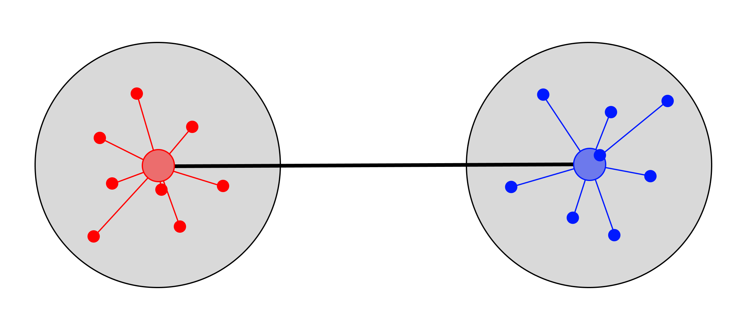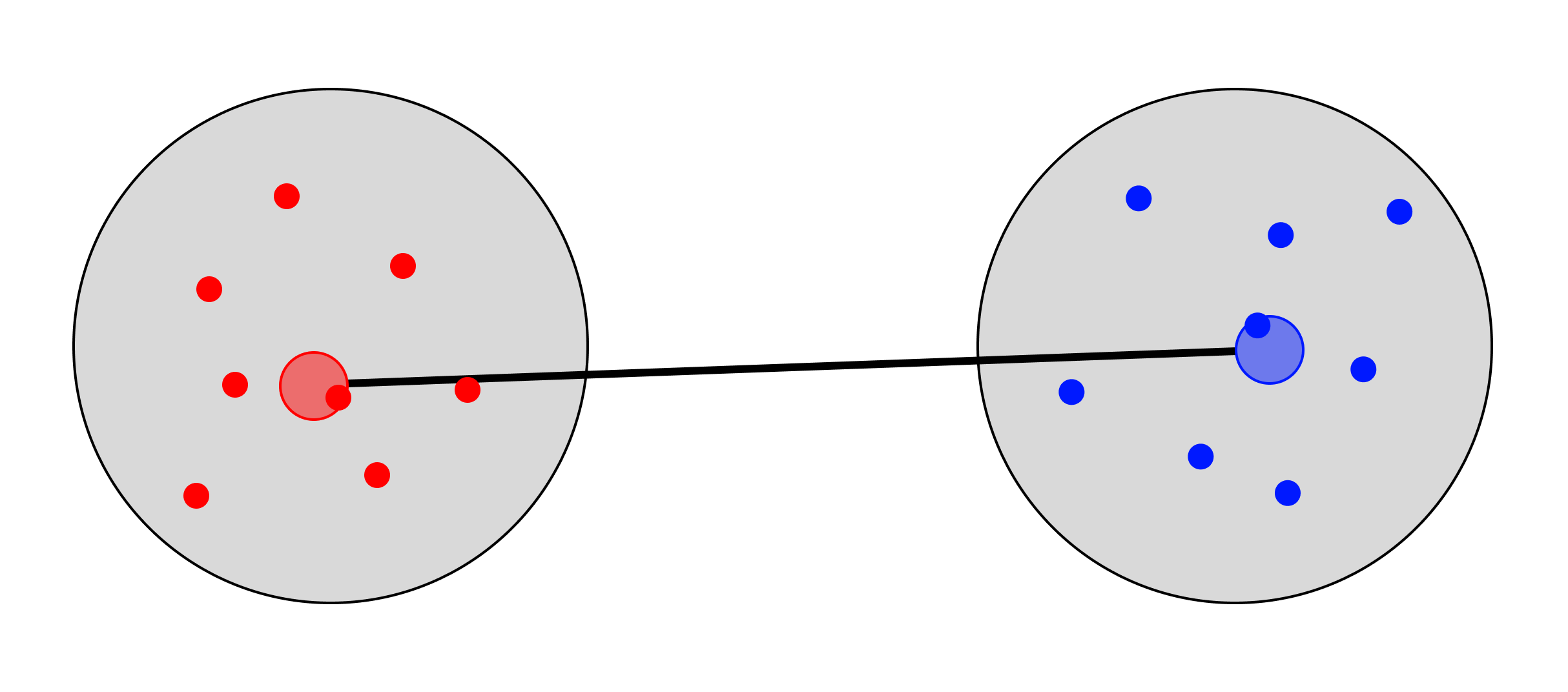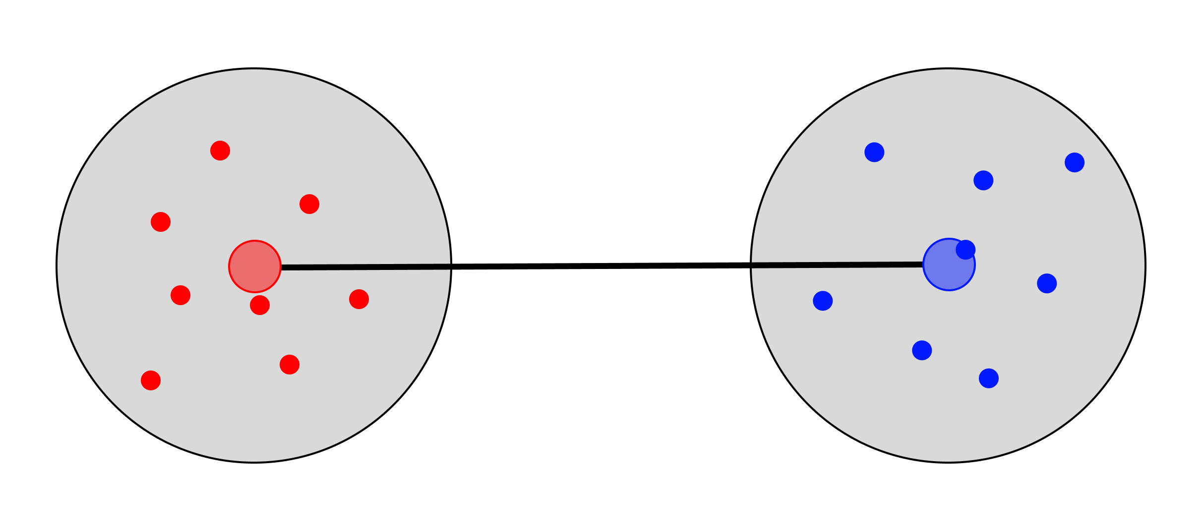 In essence, Ward's method attempts to minimize the red/blue lines within clusters in the image below, and as a result maximizes the black lines between clusters.