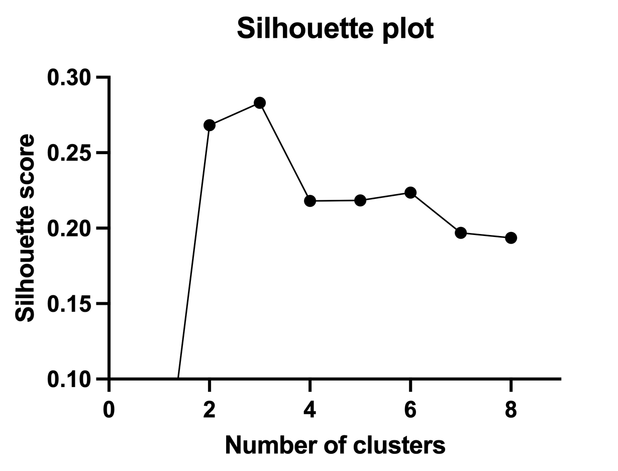 It should also be noted that the silhouette score reported by Prism depends on the distance metric selected in the analysis parameters of the clustering analysis. Because the calculation of cohesion and separation values is dependent on the distance between points, specifying a different distance metric will change how these distances are calculated, and will very likely change the final calculated silhouette score.