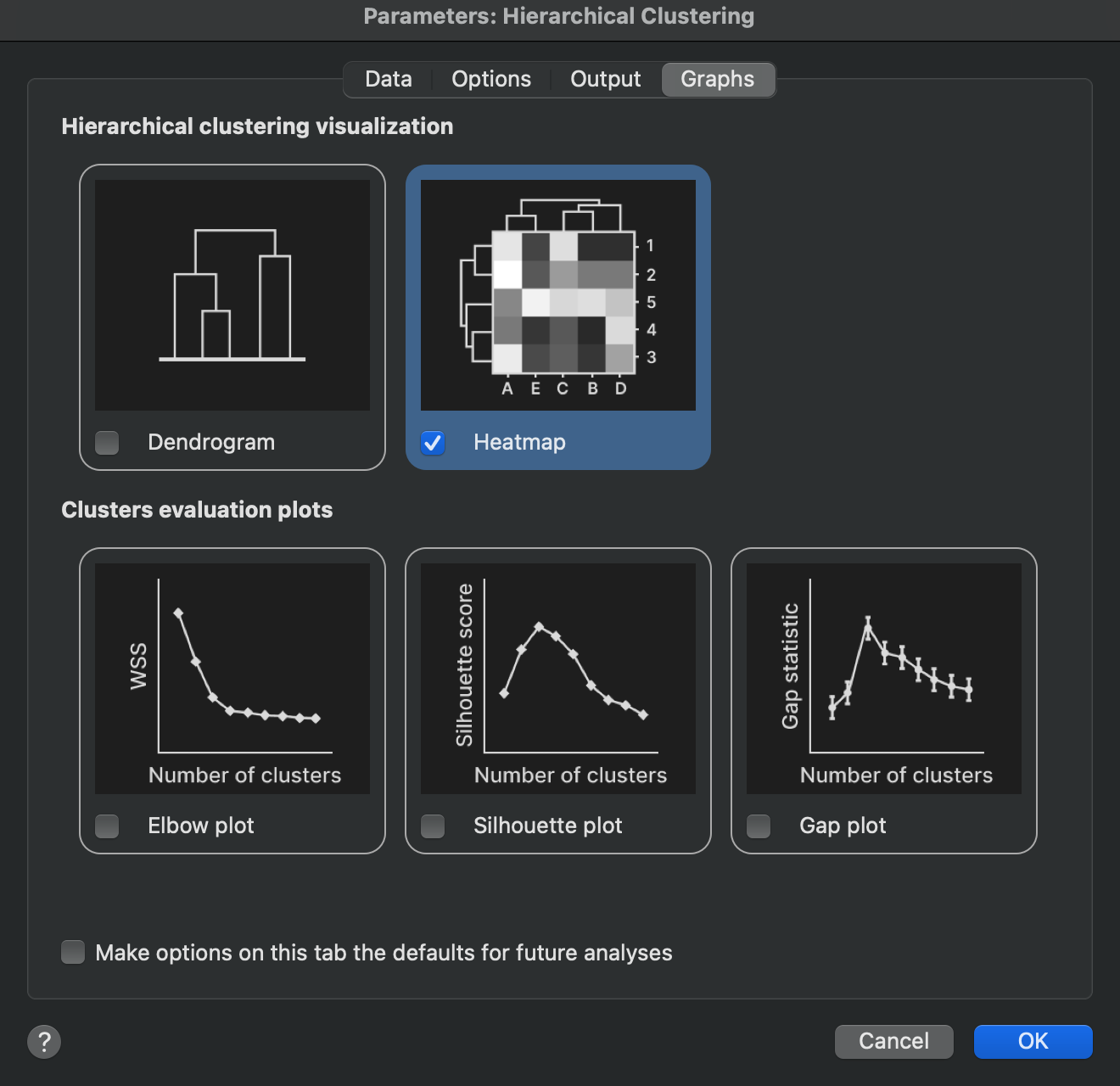 The most familiar output of hierarchical clustering is easily its visual representation in the form of heatmaps and dendrograms. This tab of the analysis parameters allows you to specify which graphs you would like to generate as part of the output of the analysis.