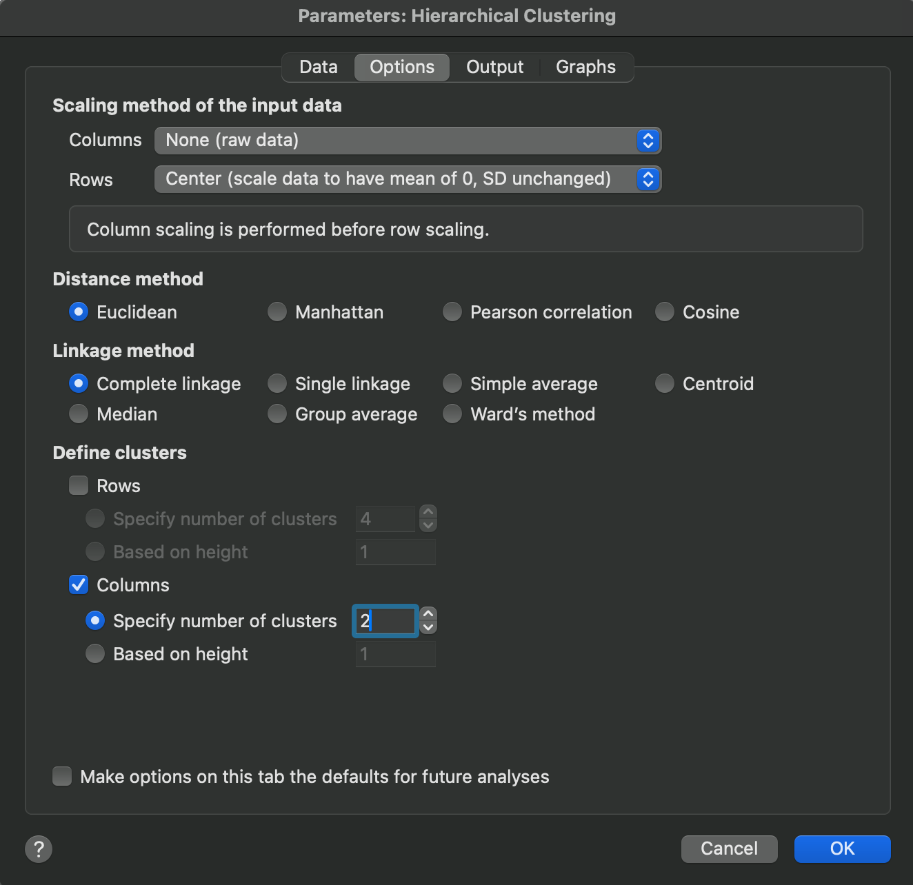 Depending on whether you’re performing clustering on rows or columns, you will have the ability to specify how to define the final cluster output for rows or columns separately.