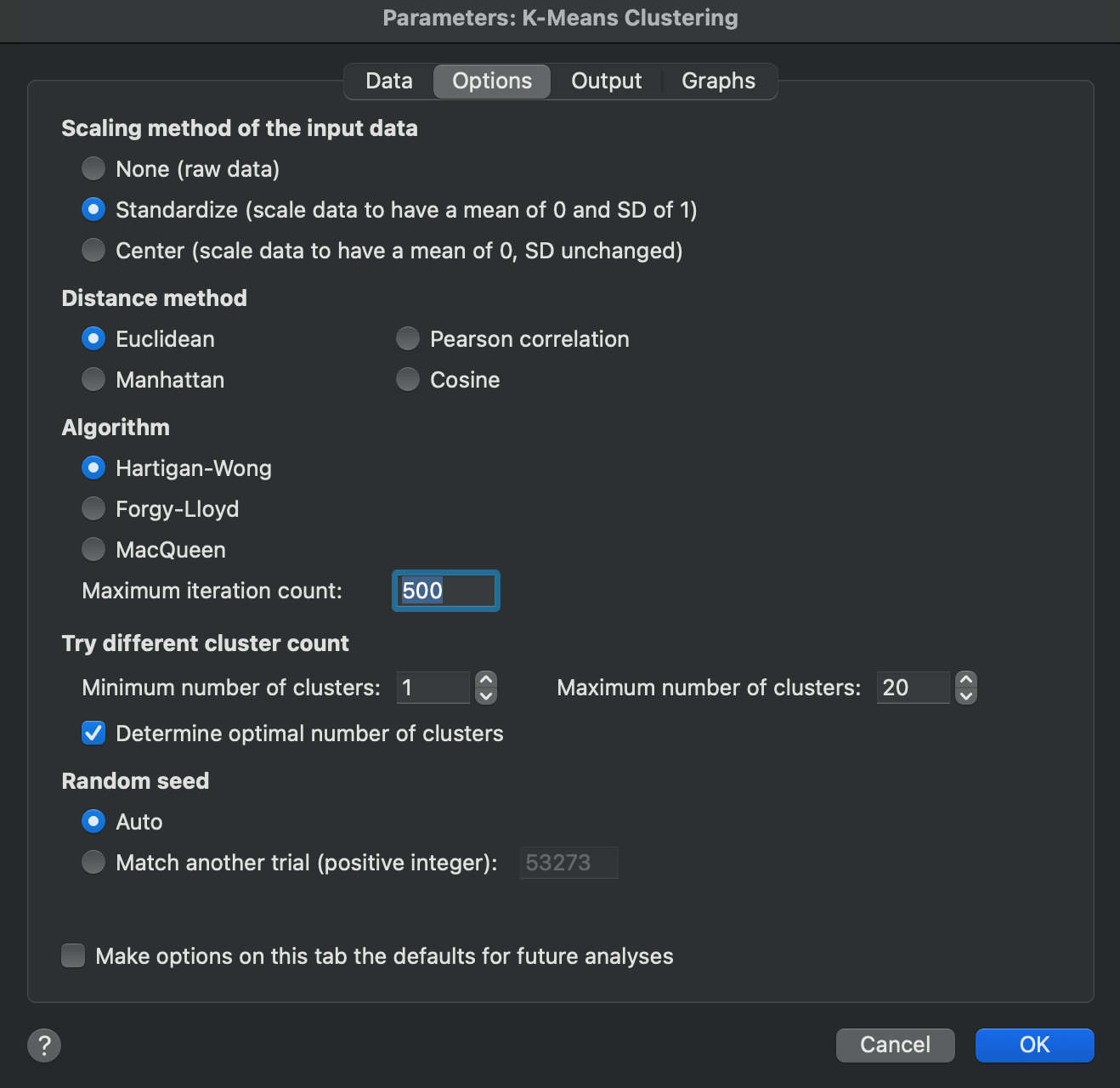In addition to manually specifying a range of cluster numbers to test, Prism also offers an automated approach to determine the optimal number of clusters for your data (and other analysis options). When you check the "Determine optimal number of clusters" option, Prism will evaluate multiple clustering solutions and recommend the best number of clusters based on statistical consensus.