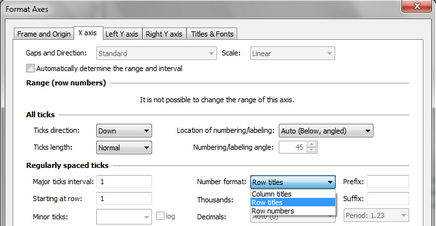 If you entered both X values and row titles on an XY data table, you can choose to label the axes with Row Titles instead of Decimal numbers via the Format setting in the Regularly spaced ticks section of the Format Axis dialog. If you do this, Prism will ignore the X values entirely, and use the row number (top row is 1) as the X values when plotting values.