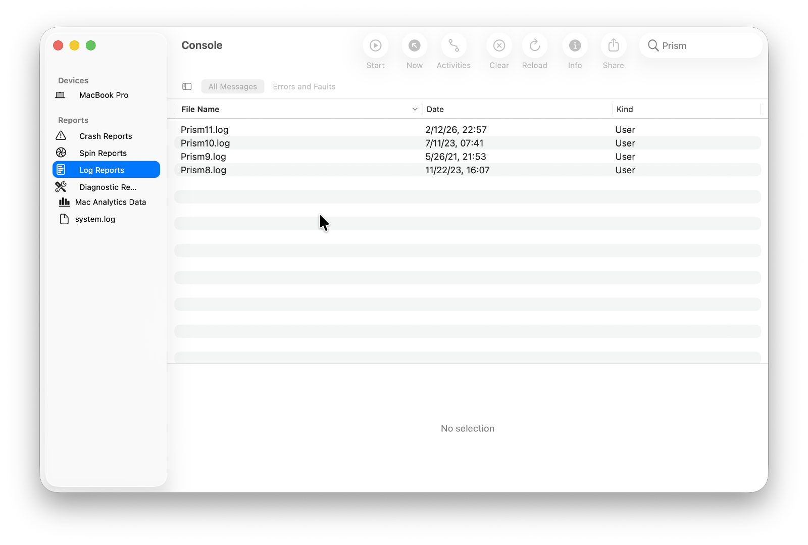 After you have launched the Console app, select “Log Reports“ from the “Reports“ section and locate the Prism log manually, or type Prism in the search bar in the top right corner of the window.