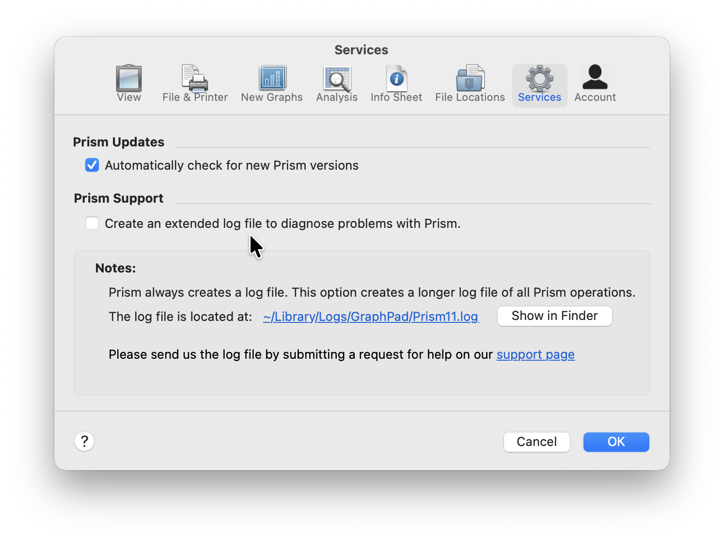 The log file is located at ~/Library/Logs/GraphPad. Another way to find the log is to run Prism, open Prism > Settings > Services tab from the Menu bar, or use “Command + ,” shortcut on your keyboard. Click "Show in Finder" to go to the folder where the log is located.