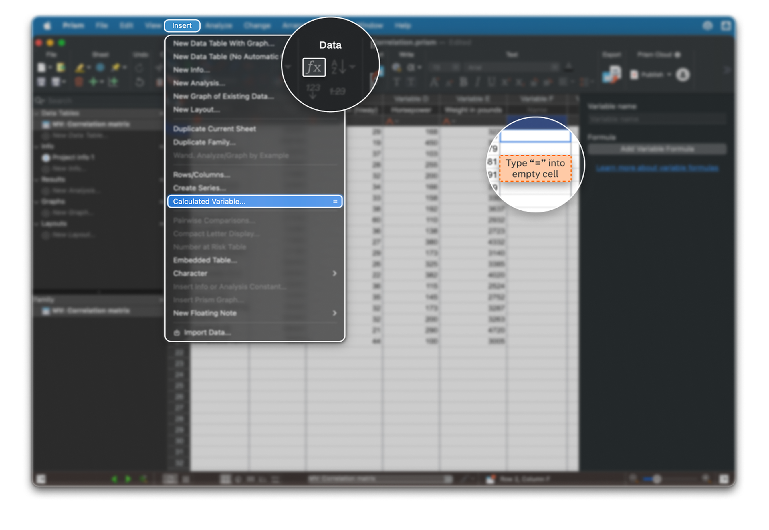 Create new variables with spreadsheet-style formulas directly inside Multiple Variables tables, included with Prism Pro and Enterprise.