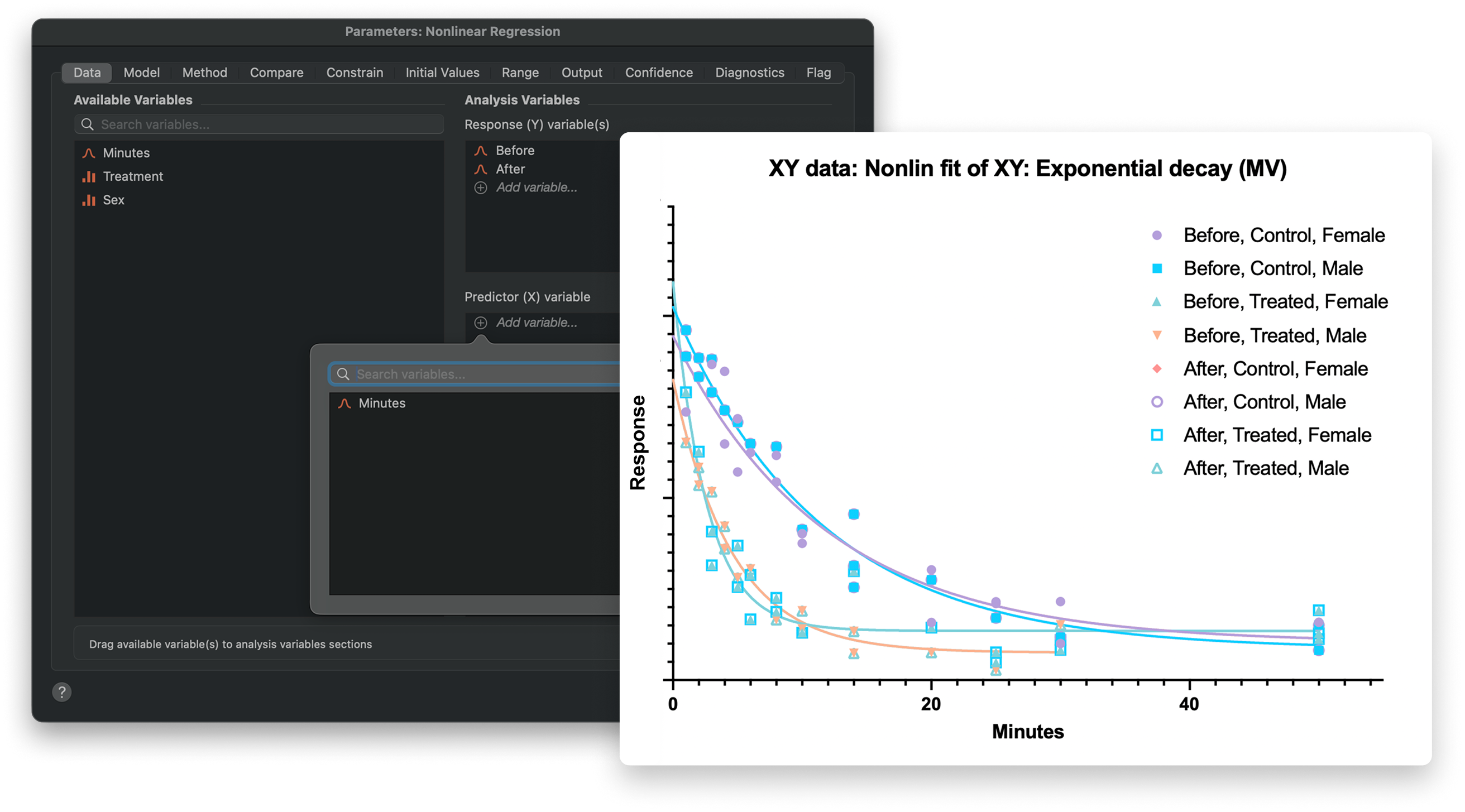 Perform t-tests, nonlinear regression, and Kaplan-Meier survival analysis directly from Multiple Variables tables by assigning variables to analysis roles.