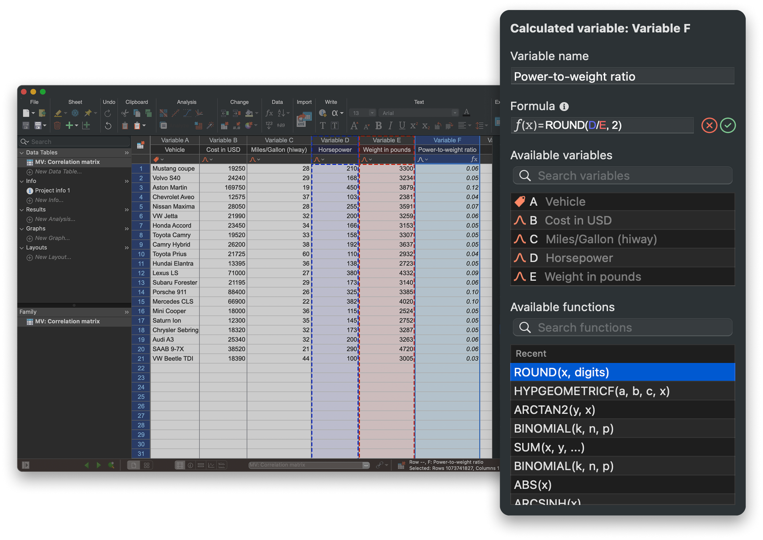 Cleaner Project Files: Created variables become part of the data table itself rather than separate transform or analysis sheets. This lets you generate transformed variables specifically for analyses or graphs, keeping your project files cleaner and your workflow more efficient.